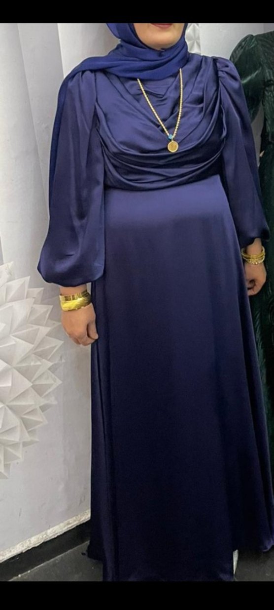Drapeli, yüksek yakalı ve uzun kollu lacivert uzun abiye elbise. Salaş kesimiyle mütevazı tarz için uygundur, düğünlere uygun. ✨