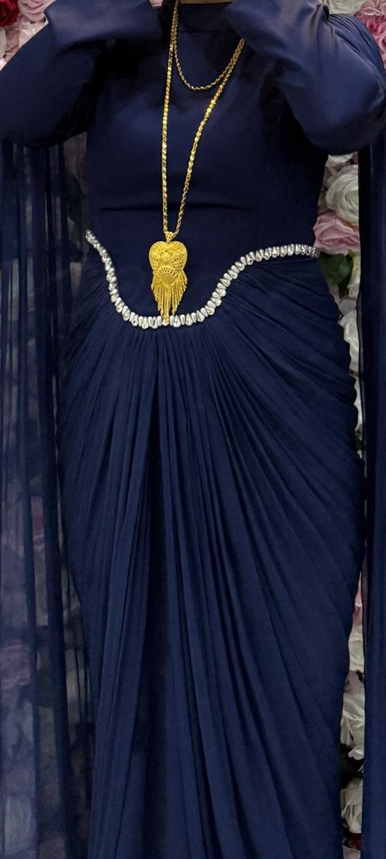 Drapeli ve nakışlı detaylara sahip, parlak lacivert kumaştan, sıfır kol ve tekne yaka uzun abiye elbise. Klasik ve şık tasarım, düğünler için uygun. ✨