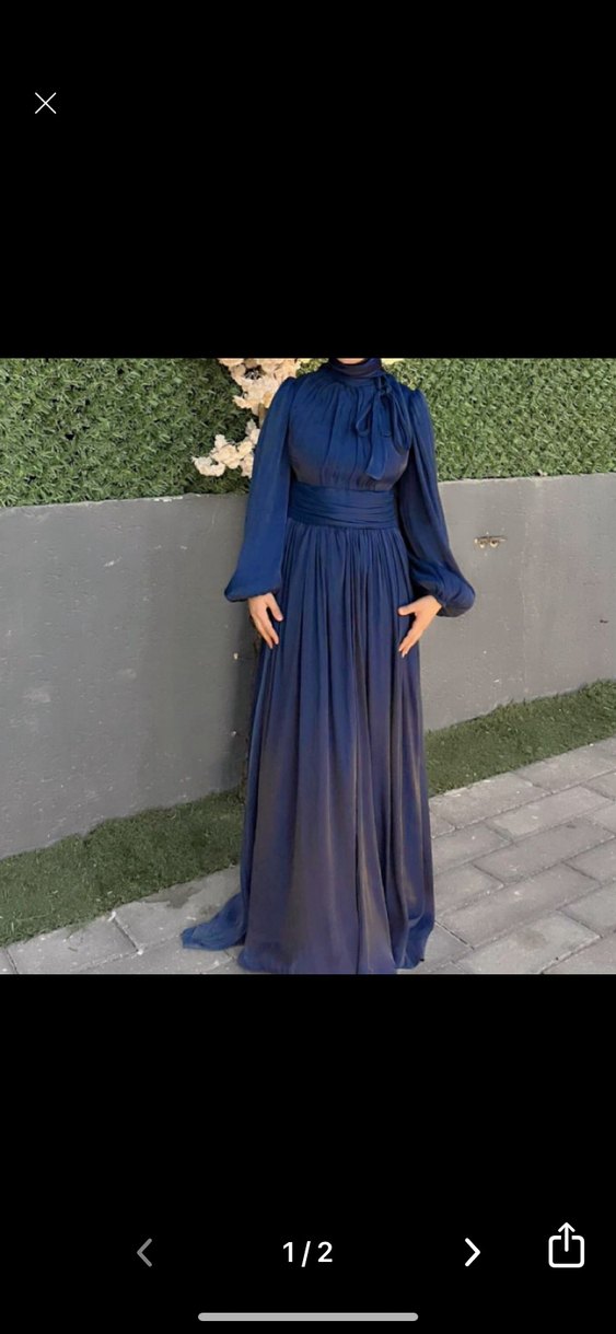 Lacivert renkli, yüksek yakalı ve uzun kollu drapeli uzun abiye elbise. Düzenli kesim ve modern klasik tarzda, düğün için uygundur. ✨