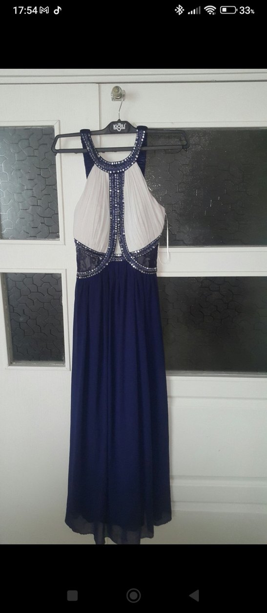 Bu kolsuz uzun abiye elbise, straplez yakalı ve drapeli tasarıma sahiptir. Lacivert renk ve baskılı deseniyle düğünler için uygundur.