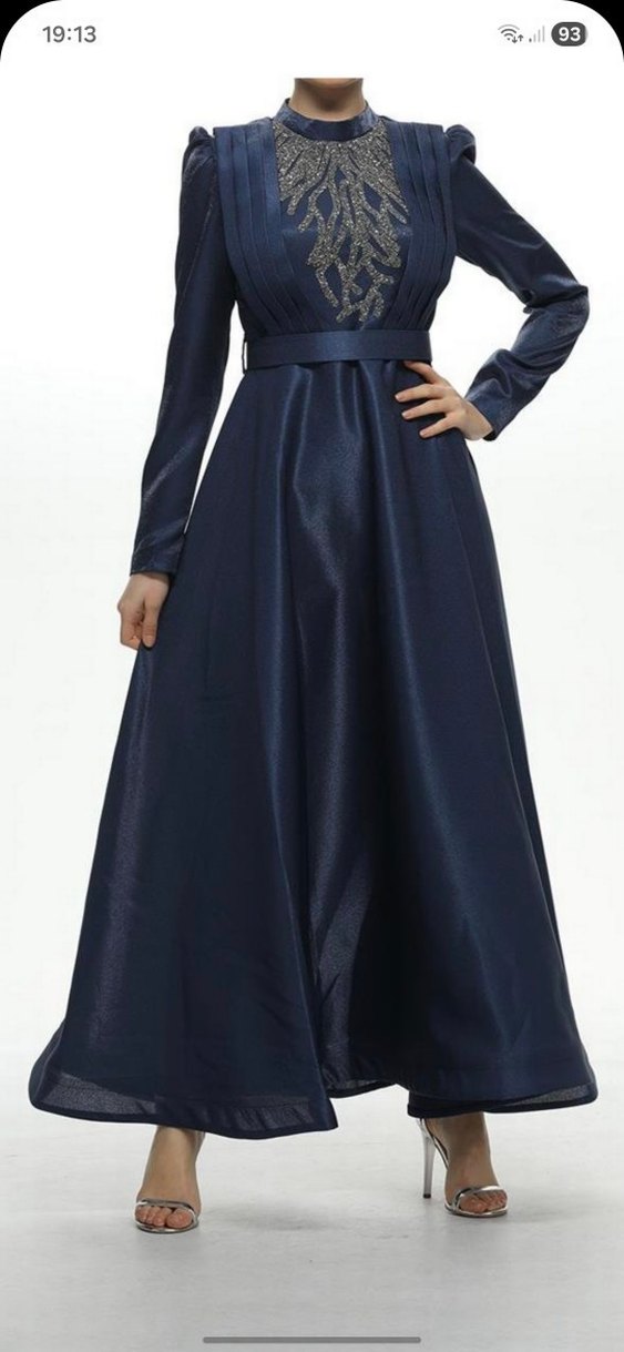 Lacivert renkte, uzun kollu ve tek parça drapeli uzun abiye elbise. düz ve parlak kumaştan yapılmıştır. Sadece 2 sefer giyildi.