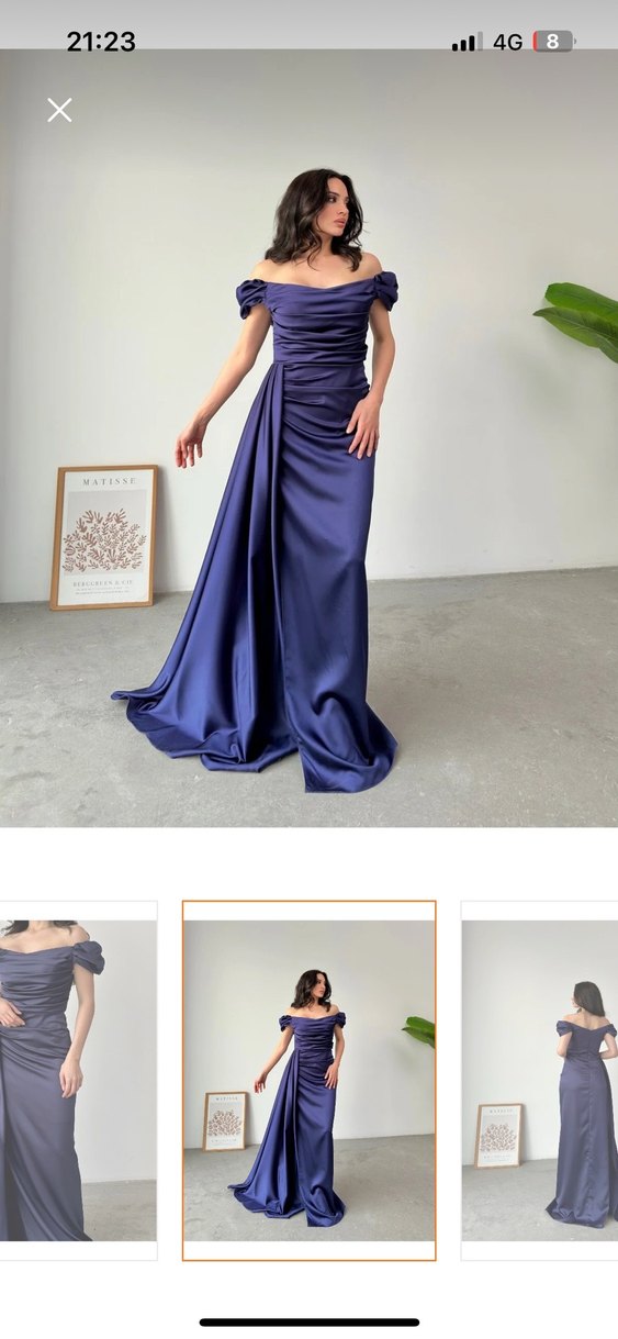 Lacivert renkte, drapeli uzun abiye elbise. Kayık yaka ve ince askılı, düzenli kesim ile parlak görünüm sunar, düğünler için uygun. ✨