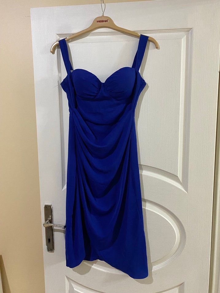 Bu dar kesim lacivert abiye elbise, drapeli tasarımı, askısız yaka ve kolsuz stiliyle romantik akşamlar için uygundur.