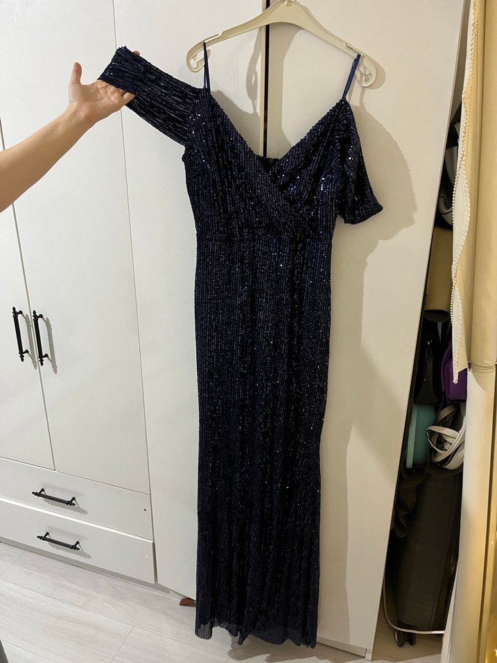 Drapeli, V yaka ve askılı lacivert uzun abiye elbise, şık ve modern klasik tarzda, partiler için uygun. 1kere düğünde giyildi