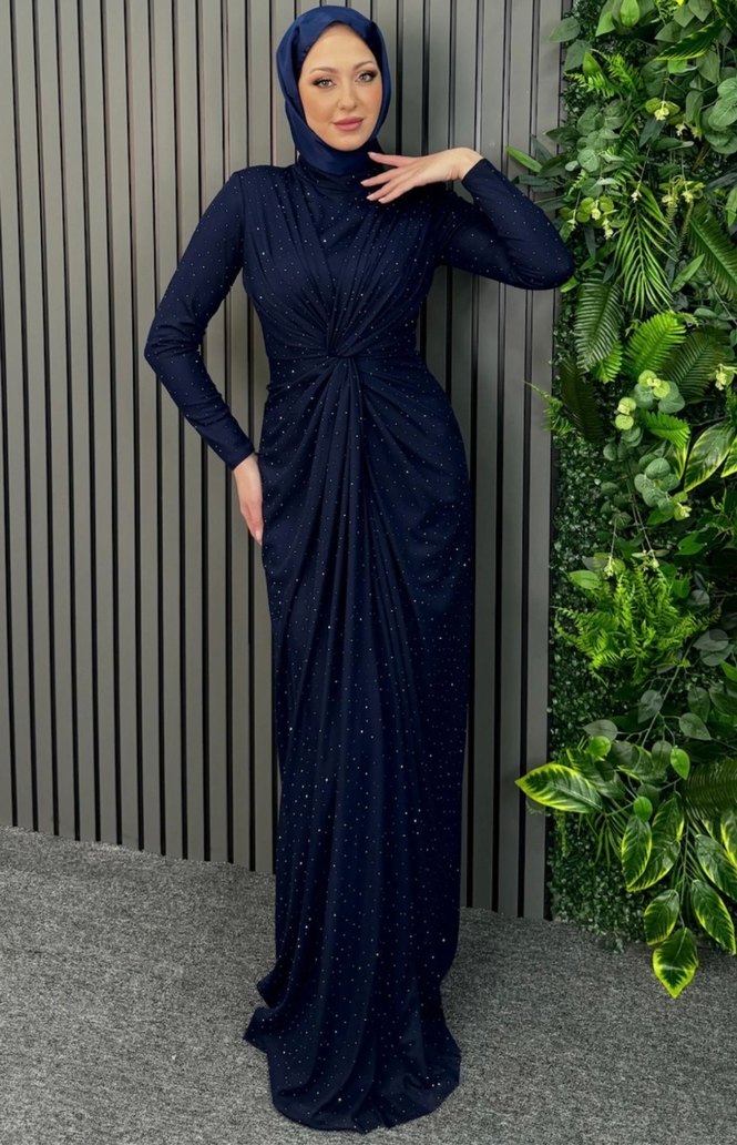 Lacivert renkte, yüksek yakalı, uzun kollu ve vücuda oturan drapeli uzun abiye elbise. Düğünler için uygun, zarif detaylarla süslenmiştir.