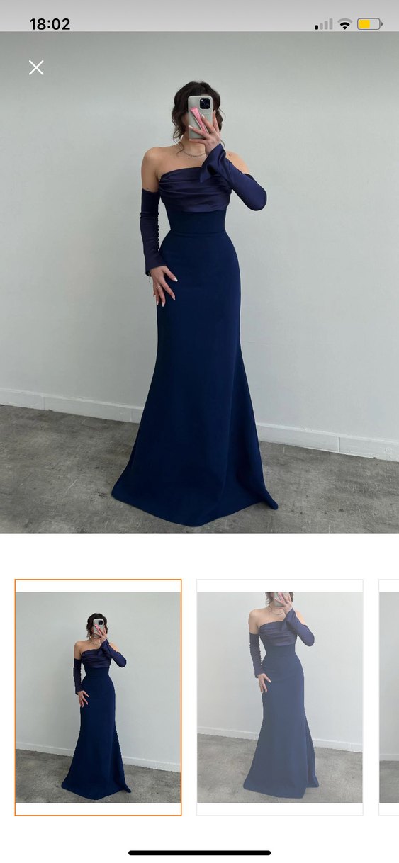 Lacivert uzun abiye elbise, drapeli tasarımı, tek omuz ve uzun kollu detaylarıyla şık bir görünüm sunar. Düğün ve özel davetler için uygundur. Yalnızca bir kere giyildi