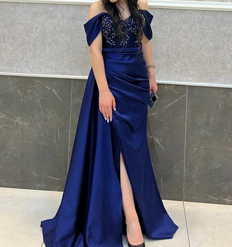 Askılı, drapeli ve nakışlı lacivert uzun abiye elbise. Parlak kumaş, kolsuz ve normal kesim. Düğün ve özel davetler için uygundur. transparan kısmı kapatıldı açılır şekilde, 36_38 benden uyumlu