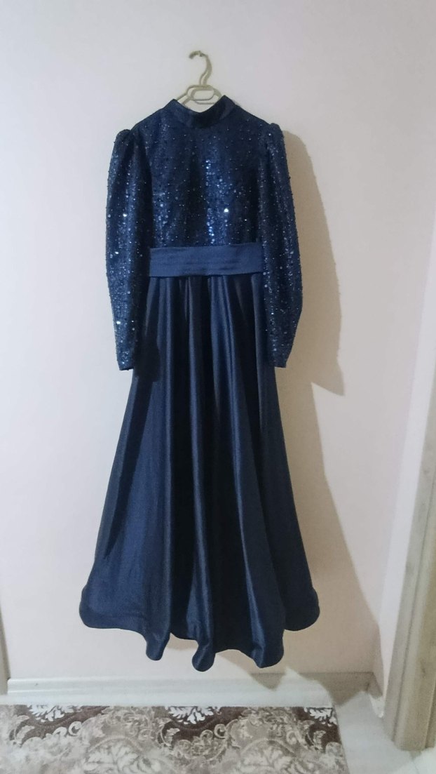 Lacivert uzun abiye elbise, yüksek yaka ve uzun kolludur. Üst kısmı payetlerle süslü, etek kısmı ise akıcıdır. Düğünler için uygundur. ✨