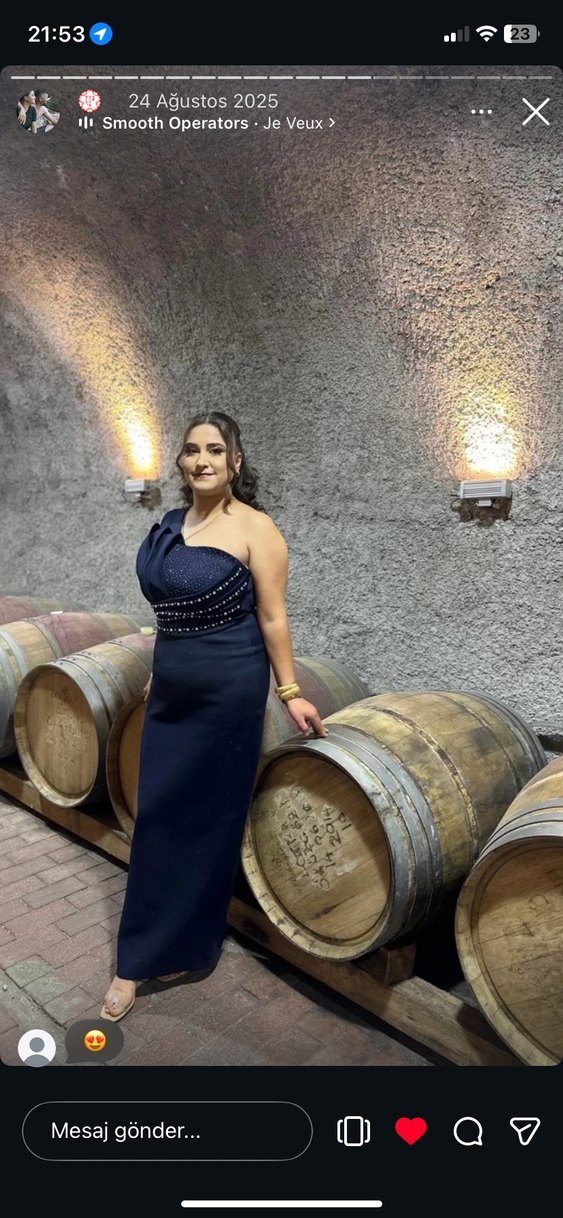 Lacivert uzun abiye elbise, straplez yakalı ve drapeli tasarımlı, parlak desenli ve ince askılı kollu, düğünler için uygun. 42-44 beden uyumlu