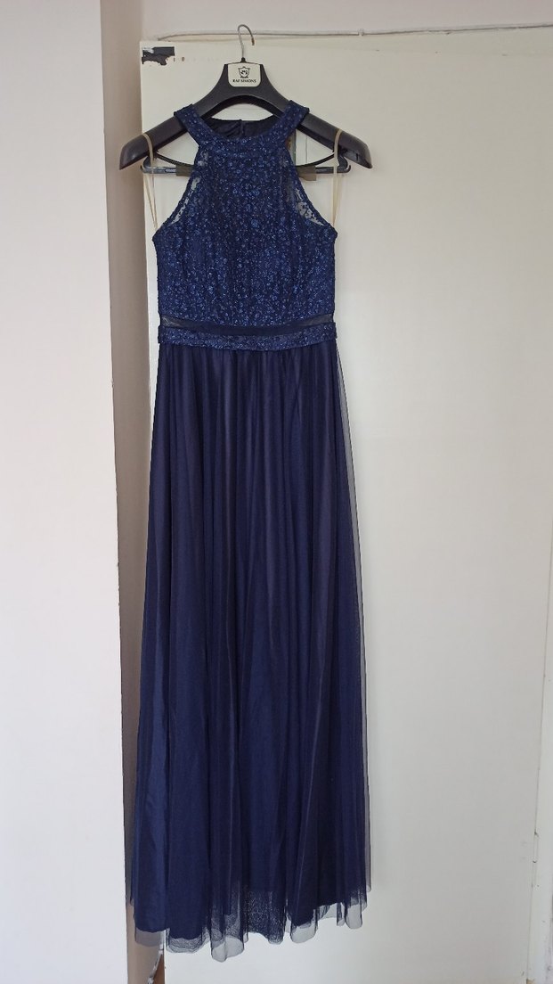 Drapeli, yüksek yakalı ve askılı lacivert uzun abiye elbise, düğün ve özel davetler için uygundur. m-l beden uygundur. ✨