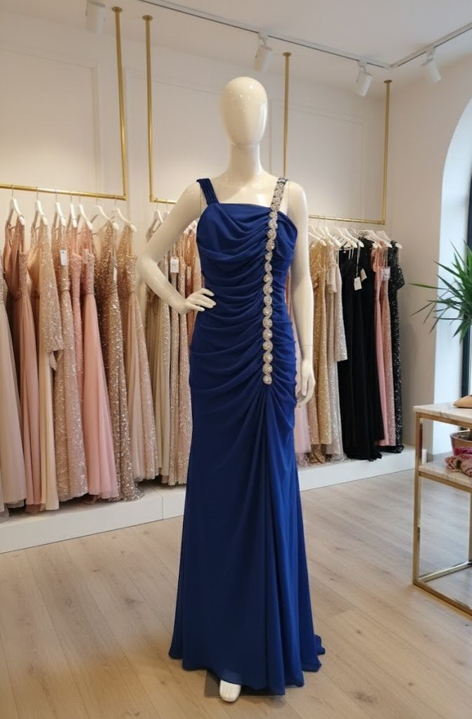 Drapeli ve nakışlı, taşlı lacivert uzun abiye elbise, düğünler için uygun. Modern klasik ve gösterişli tarzda, vücuda oturan kesimle birleşiyor. ✨