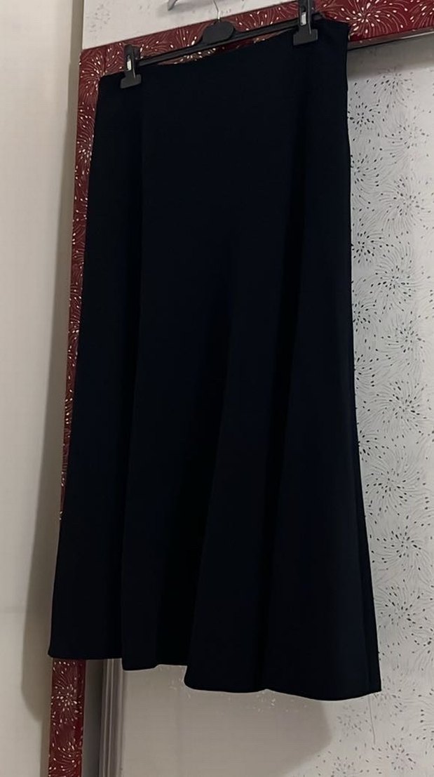 Drapeli tasarıma sahip, lacivert ve uzun, vücuda oturan sentetik kumaştan yapılmış gotik tarza uygun etek. Bel ölçüsü görselde mevcuttur.
