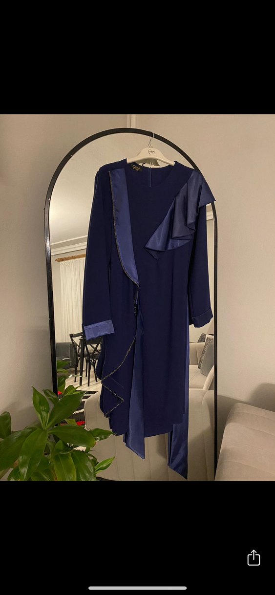 Lacivert renkli, ipeksi kumaştan, drapeli tasarıma sahip uzun hamile ceketi. Notched yaka ve uzun kollu, ofis için şık ve çağdaş bir parça.
