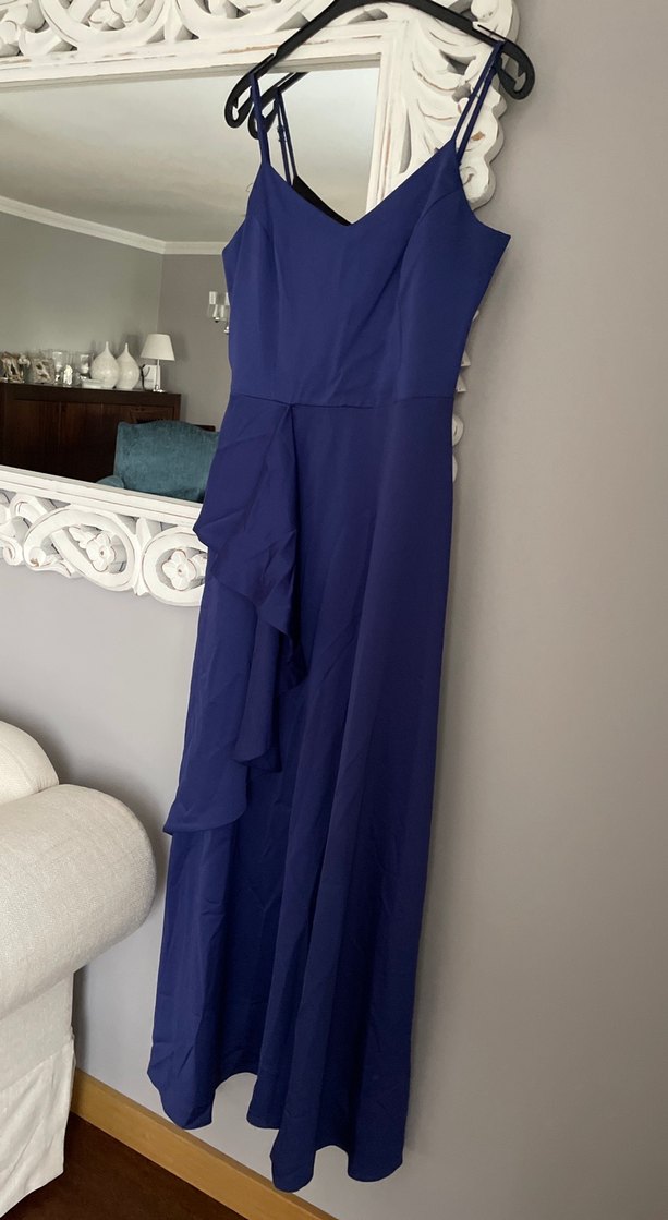 Lacivert uzun abiye elbise, drapeli detaylı, kolsuz ve V yakalıdır. Düzenli kesim ve modern klasik tarzda, düğünler için uygundur.