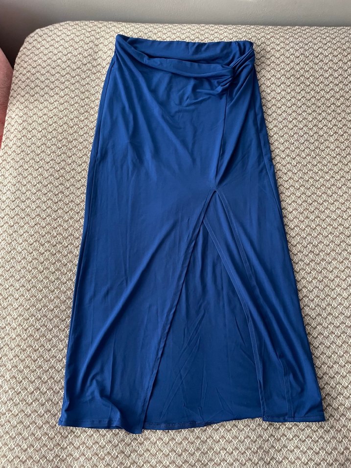Lacivert, drapeli ve fitted kesim uzun kadın eteği, yumuşak sentetik kumaştan üretilmiştir, günlük kullanım için uygundur.