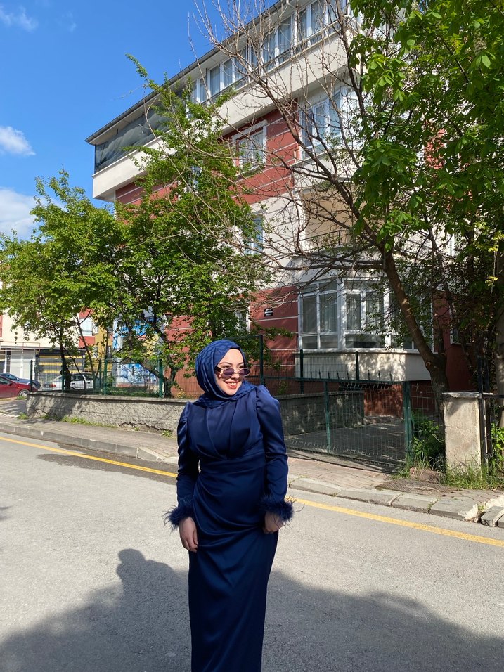 Drapeli Lacivert Uzun Kol Henna Elbise