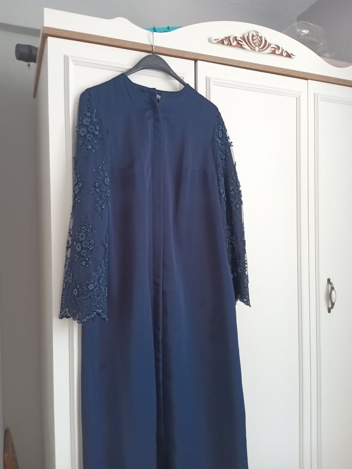 Lacivert uzun kollu abiye ferace drapeli tasarım ve dantel detaylı kollarıyla mütevazı ve sade bir görünüm sunar, düğünler için uygundur.