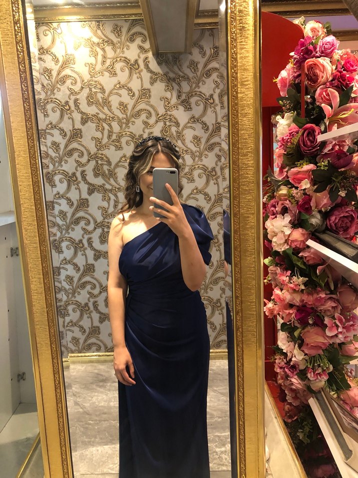 Lacivert, parlak kumaştan drapeli ve tek omuz uzun abiye elbise. Klasik ve modern kesimiyle düğünler için uygun. Özel kumaşı var düz saten değil. Saklamak istiyordum ama maalesef doğum yaptığım için artık içine giremem :) Sadece bir kez giydim paketi ile duruyor. 38 beden.