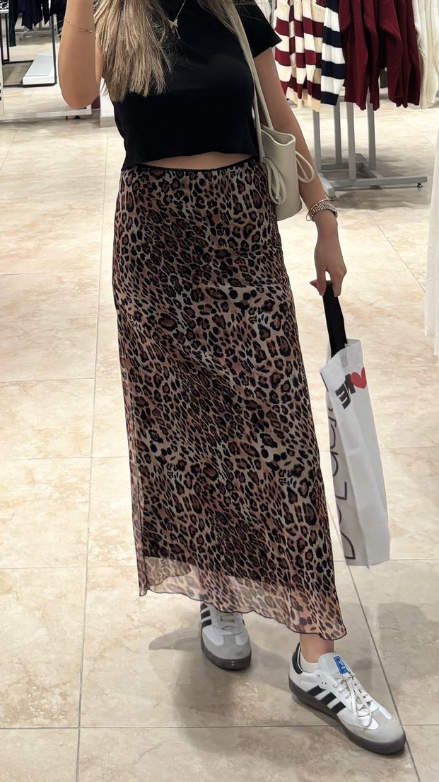 Kahverengi, leopar desenli uzun etek, bol kesim ve drapeli tasarımıyla günlük rahat kullanım için yumuşak sentetik kumaştan üretilmiştir.