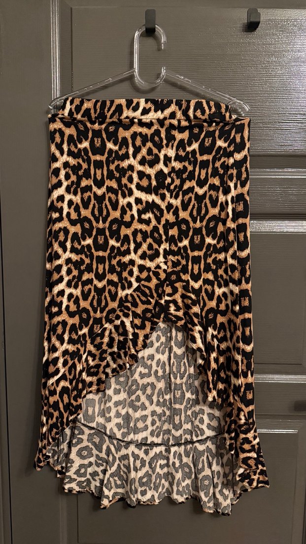 Drapeli, koyu kahverengi leopar desenli uzun etek. Yumuşak sentetik kumaştan, bol kesim ve bohem tarzına uygun.