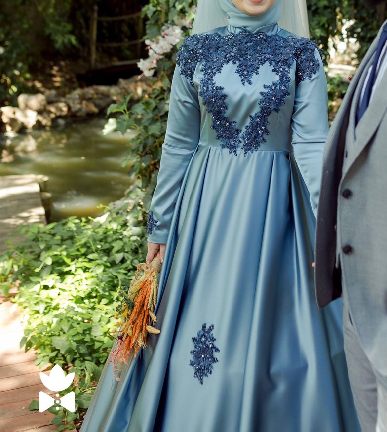 Drapeli Mavi İşlemeli Uzun Kollu Nişan Elbisesi