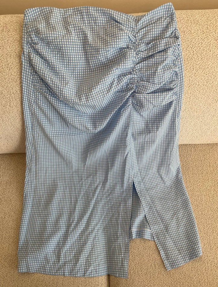Mavi ve gri kareli desenli, drapeli ve fitted kesim hamile eteği. Midi boyda, yumuşak sentetik kumaştan, ofis için uygun.