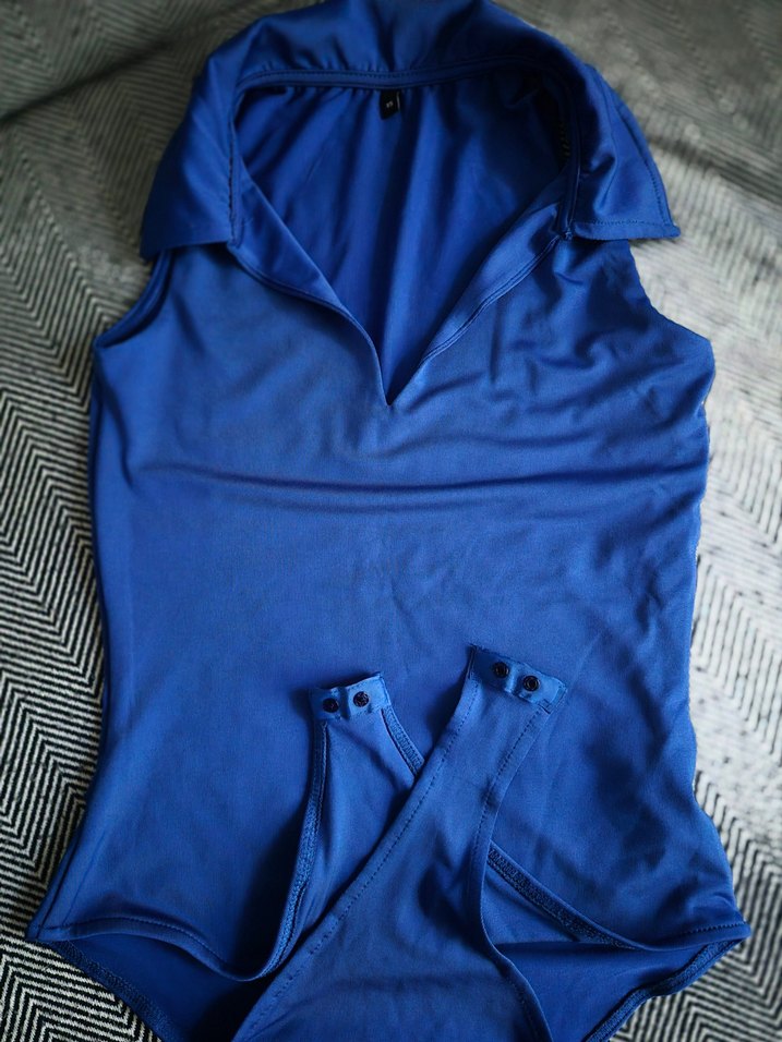Kolsuz, yakalı ve drapeli tasarıma sahip mavi Yumuşak sentetik kumaştan, günlük sokak stili için uygundur.