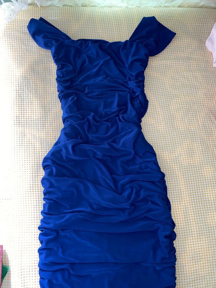 Drapeli, mavi midi boy, tek parça abiye elbise. Kayık yaka ve kolsuz tasarımıyla şık ve modern bir görünüm sunar.