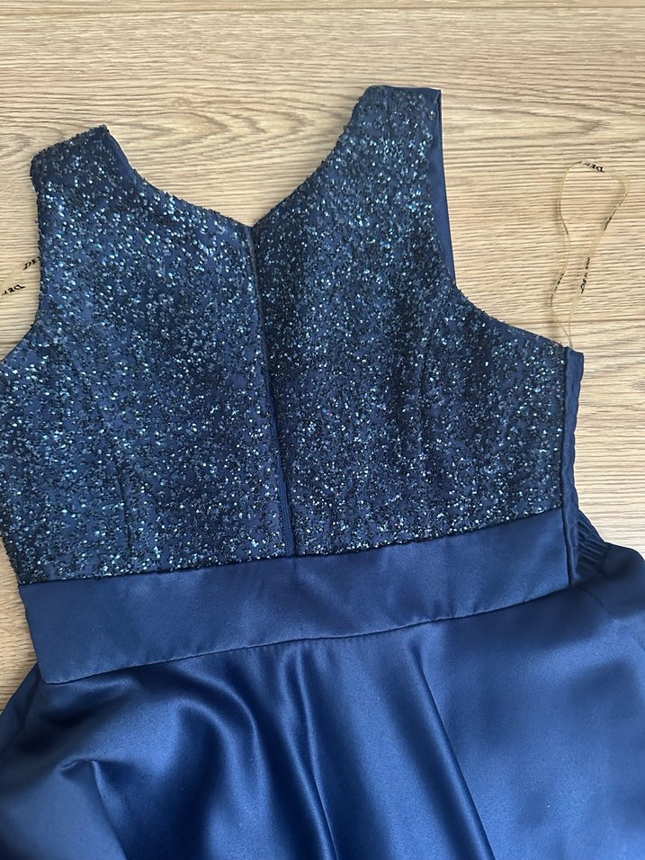 Kolsuz, V yaka, drapeli mavi midi elbise. Parlak kumaşıyla parti için göz alıcı ve şık bir seçim. ✨koltuk altından bele doğru lastiklidir arkası fermuarlı kloş bir abiye elbise