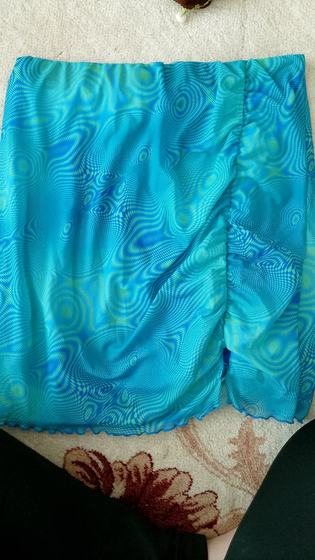 Drapeli, parlak mavi bağlama desenli hamile eteği. Yumuşak sentetik kumaştan, midi boyda ve bohem tarzda, plaj için uygun. hiç kullanmadım etiketi yok hamile olmasanizda giyilir