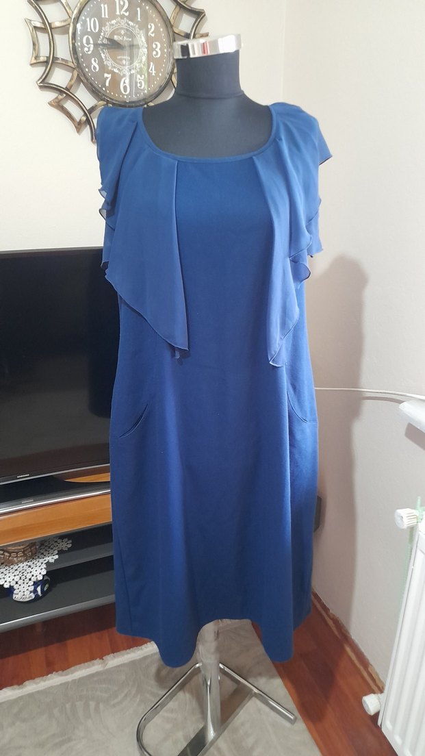 Drapeli, mavi renkte, bol kesim midi elbise. Kolsuz ve yuvarlak yaka yanlarda cepleri var temiz defosuz ürün
