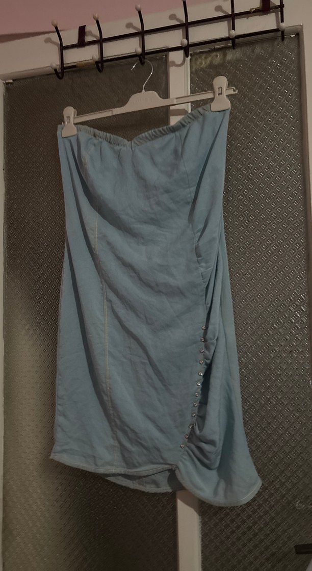 Mavi-gri tonlarda, drapeli ve yanlarında düğme detaylı, midi etek