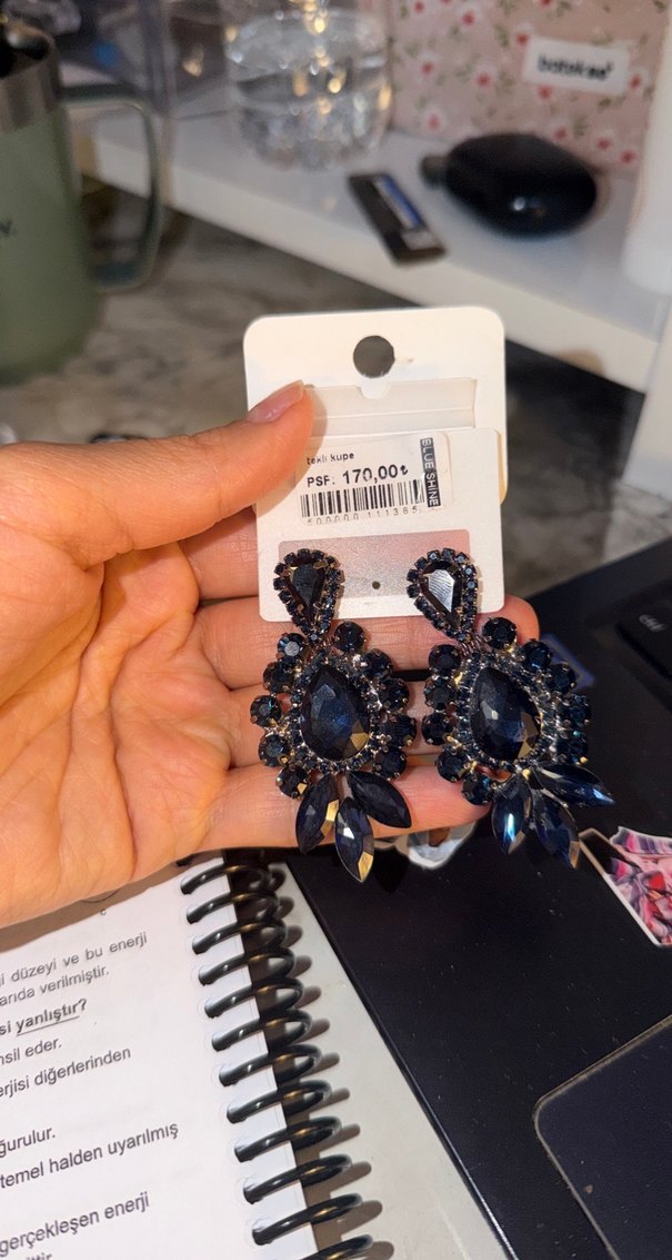 Drapeli mavi renkli, payet işlemeli ve desenli tasarıma sahip, klasik zarafet ve şık düğünler için uygun midi uzunlukta küpeler. Ben kınanda mavi kınalığımla uydurmuştum