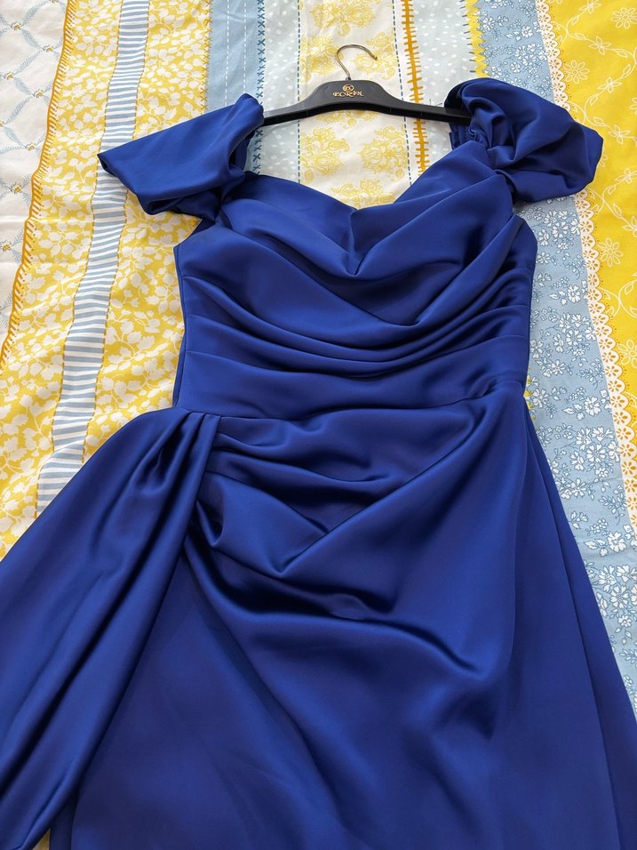 Drapeli, tek renk parlak mavi kumaştan, uzun düşük kol tekne yakalı, vücuda oturan abiye elbisedir. (Sorarak alınız)