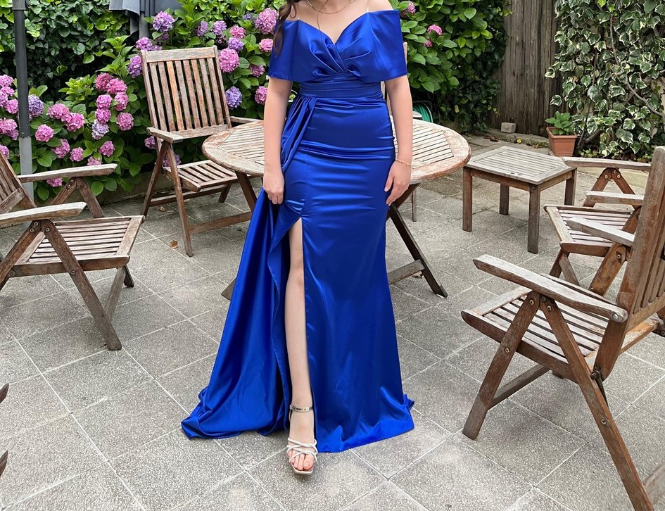 Drapeli ve askılı, straplez kesim uzun abiye elbise, parlak mavi renkte ve yan yırtmaç detaylı, düğünler için uygun.