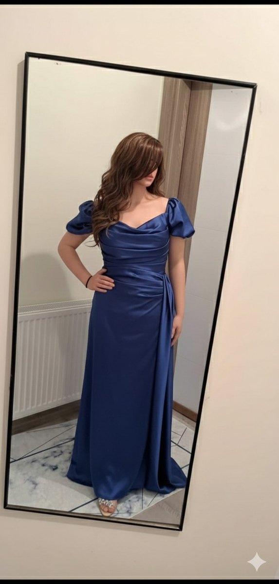 Drapeli ve straplez yakalı, uzun ve vücuda oturan mavi abiye elbise. Parlak kumaşıyla klasik şıklık sunar. ✨ M L beden uyumludur. Yalnızca bir defa giyildi.