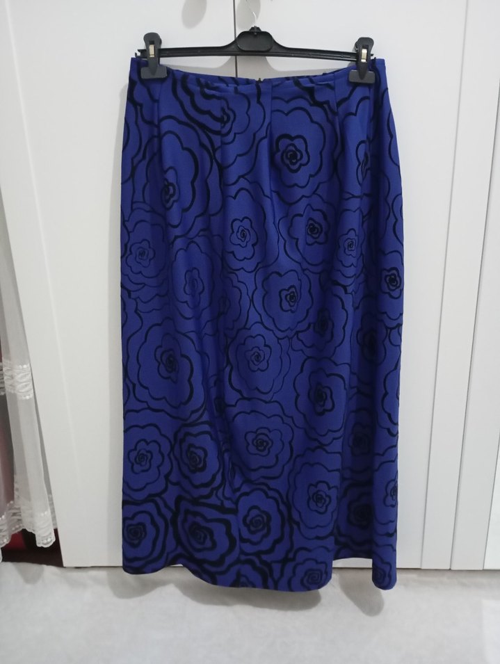Drapeli, koyu mavi bağlama desenli uzun etek. Düzenli kesim ve çağdaş tarzıyla ofis kullanımı için uygun.