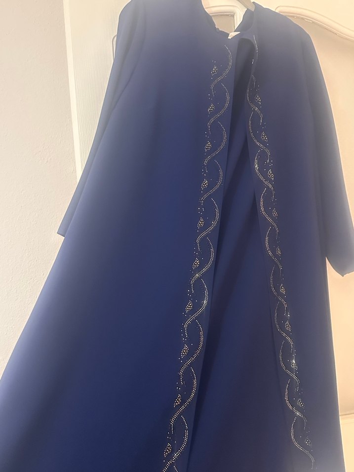 Drapeli ve işlemeli detaylara sahip uzun mavi elbise, yakası çıtçıtlı ve askılı kolludur. İpeksi, parlak kumaştan, modest ve düzenli kesimle düğünler için uygundur.