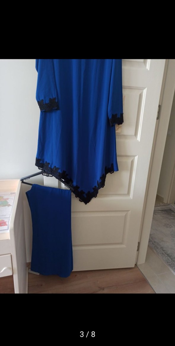 Kadınlar için drapeli, koyu mavi, saten görünümlü uzun elbise. V yaka, uzun kollu, manşet ve etek ucu siyah dantel detaylı, sade ve modern tarzda.pantolon tunik takım