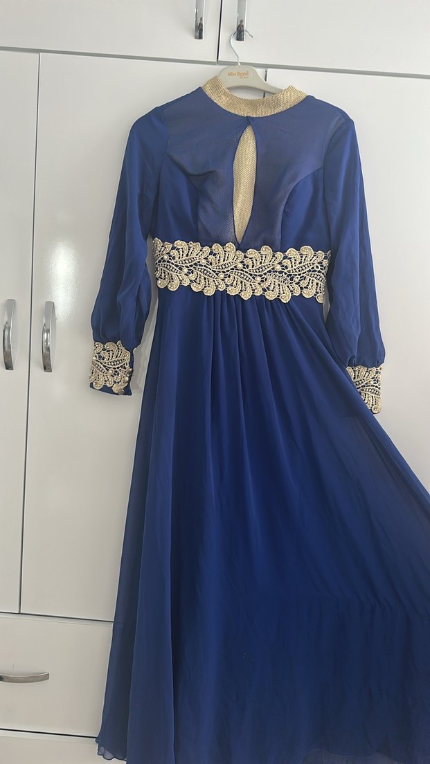 V yaka ve uzun kollu, drapeli fit kesim mavi abiye elbise. Bel, manşet ve yakada parlak işlemelerle süslenmiş, modern klasik ve vintage tarzda.