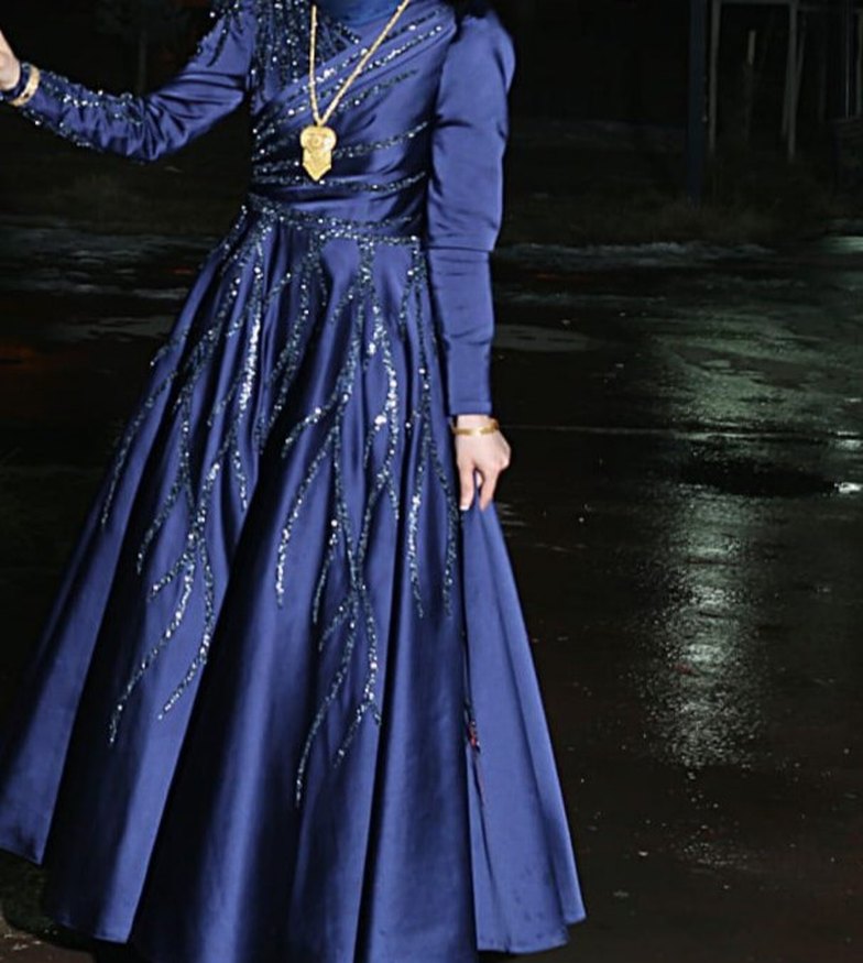 Drapeli ve işlemeli parlak desenlere sahip, uzun kollu, yakası kesik mavi abiye elbise. Düğün ve özel anlar için uygun, klasik şıklık sunar.