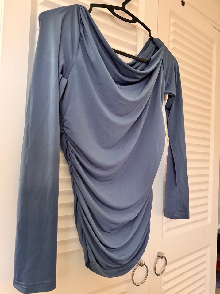 Drapeli ve kayık yaka detaylı, uzun kollu, vücuda oturan midi uzunlukta mavi bluz. Yumuşak sentetik kumaştan, günlük kullanıma uygun modern tarzda.