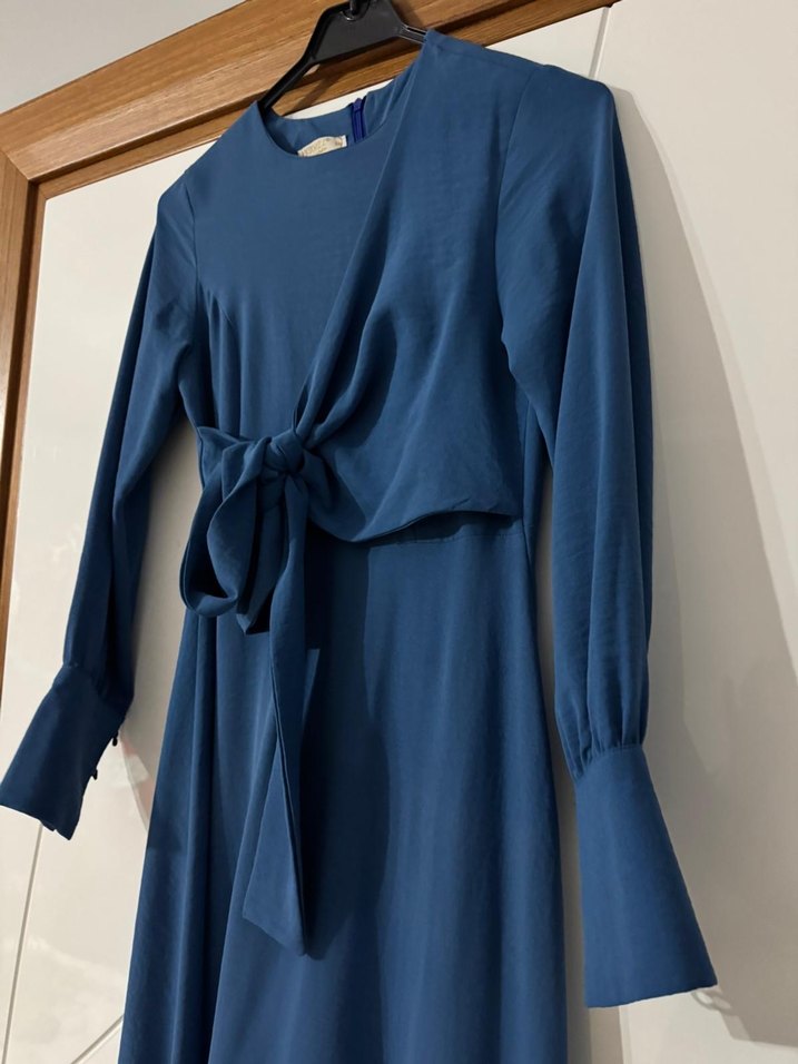 Drapeli Mavi Uzun Kollu Kadın Elbise