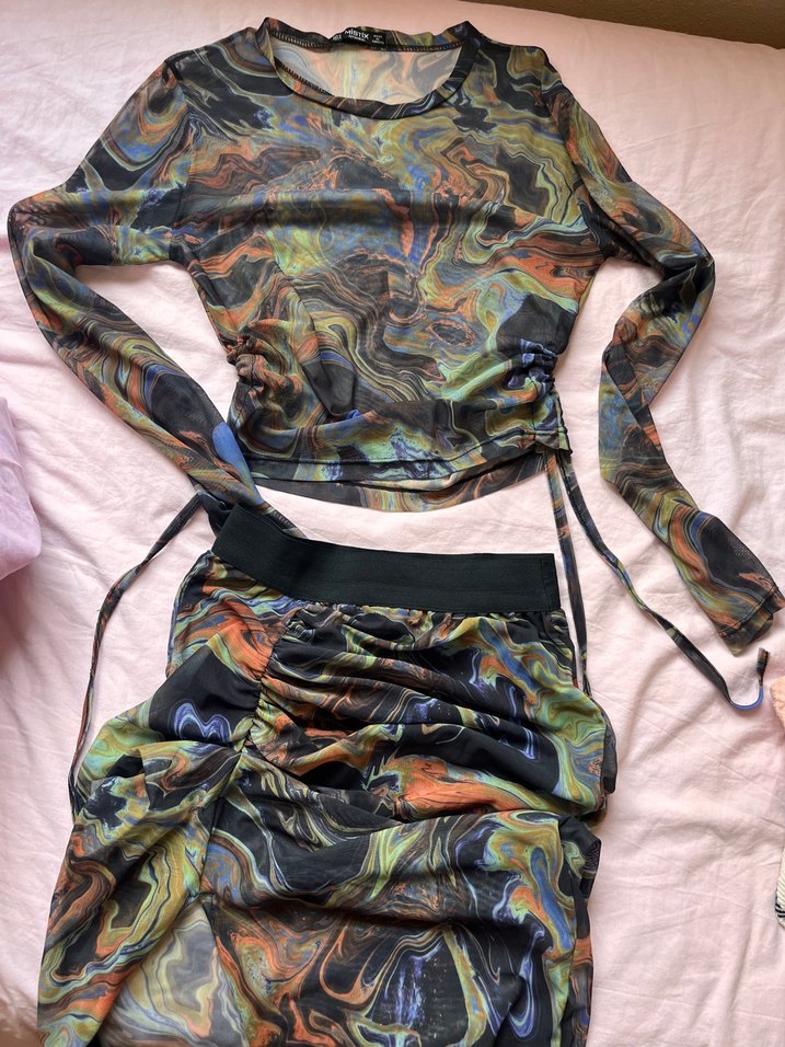 Drapeli ve bağcıklı detaylara sahip, koyu çok renkli tie-dye desenli, sentetik kumaştan yapılmış midi etek ve uzun kollu üst. İç gösterir plaj vs giyime uygun. Eteğin diz üstünde astarı vardır etek yırtmaçlı