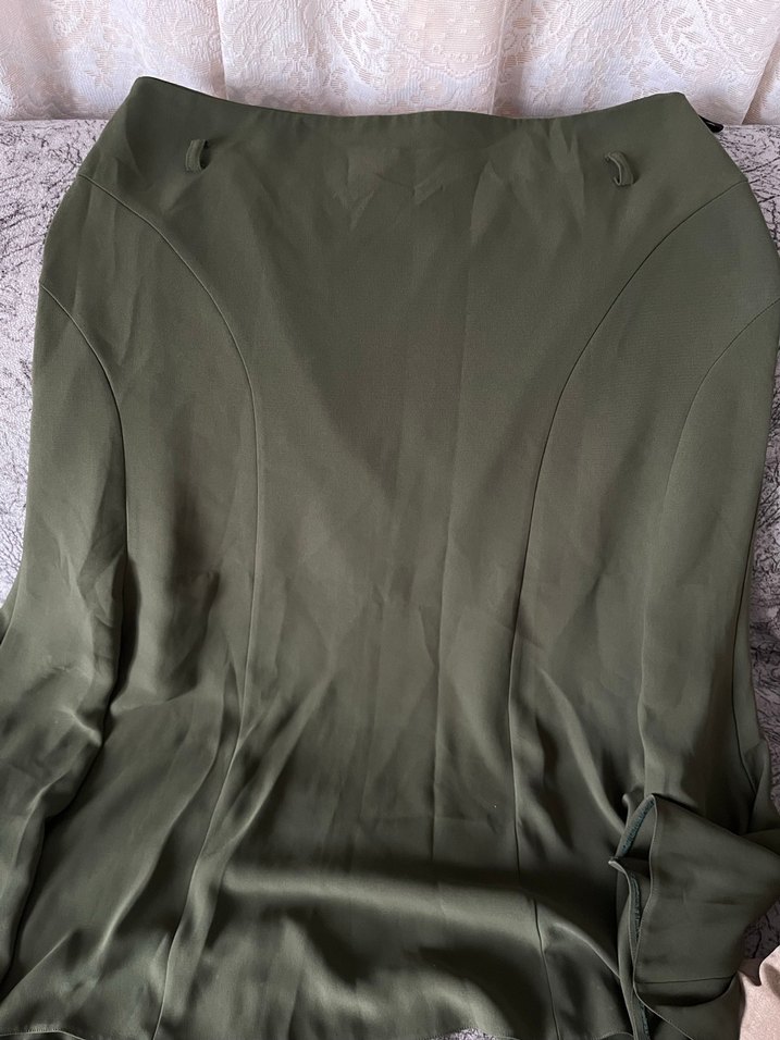 Haki renkli, drapeli tasarıma sahip, ipeksi kumaştan yapılmış, normal boy midi kadın eteği. Minimalist ve normcore tarzda, günlük kullanım için uygun.