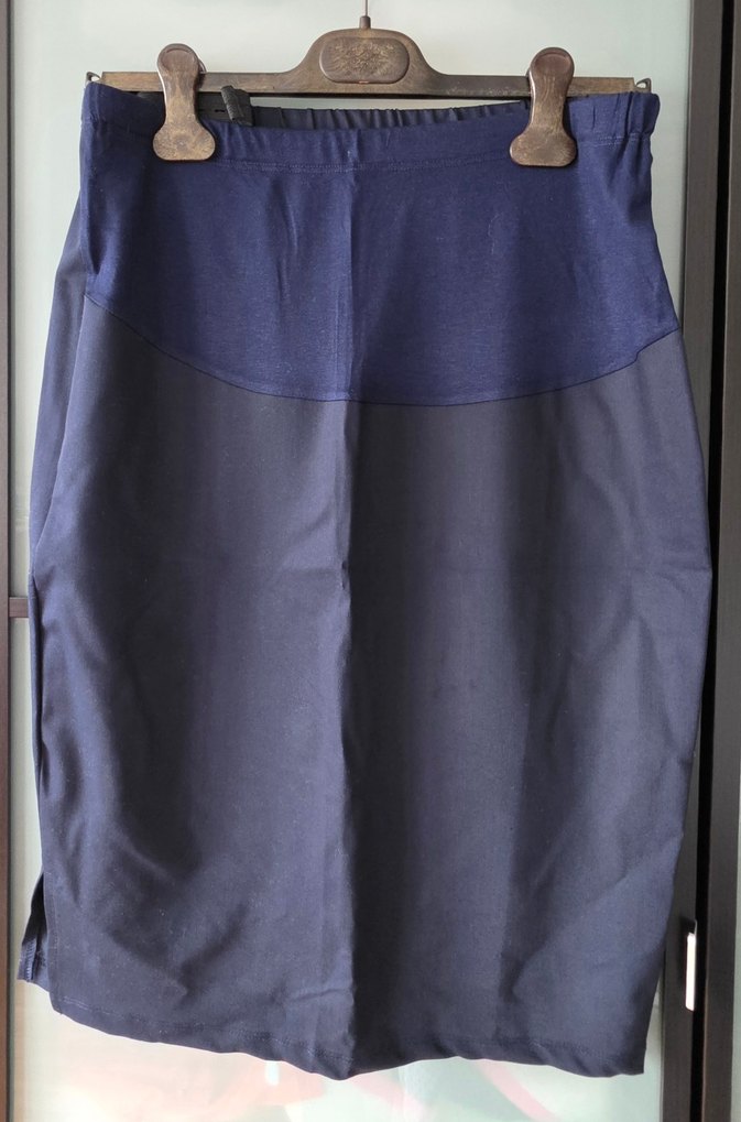 Lacivert renklerde, drapeli ve vücuda oturan midi uzunlukta hamile eteği. Ofis kullanımı için uygun, yumuşak pamuklu kumaştan üretilmiştir.