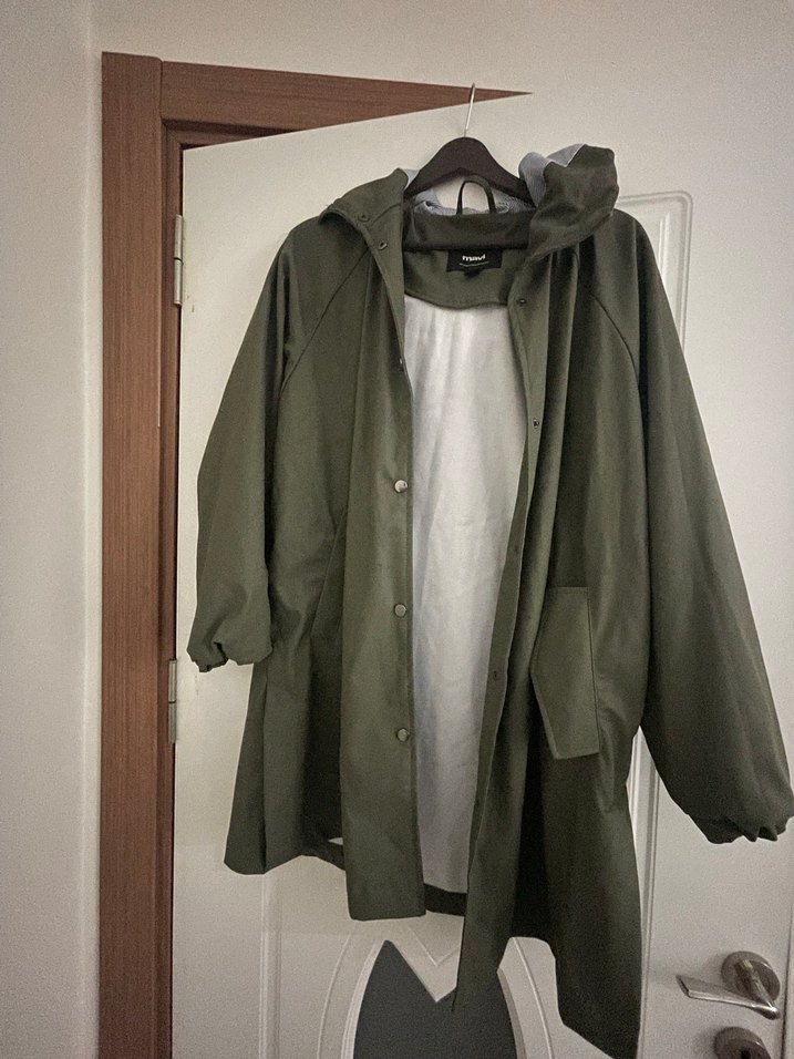 Yeşil sentetik kumaştan, bol kesim midi boy drapeli kadın yağmurluk. Uzun kollu ve yakalı, günlük sokak stili için uygun. ️kullanılmadı kalıbı geniş s - m beden olur