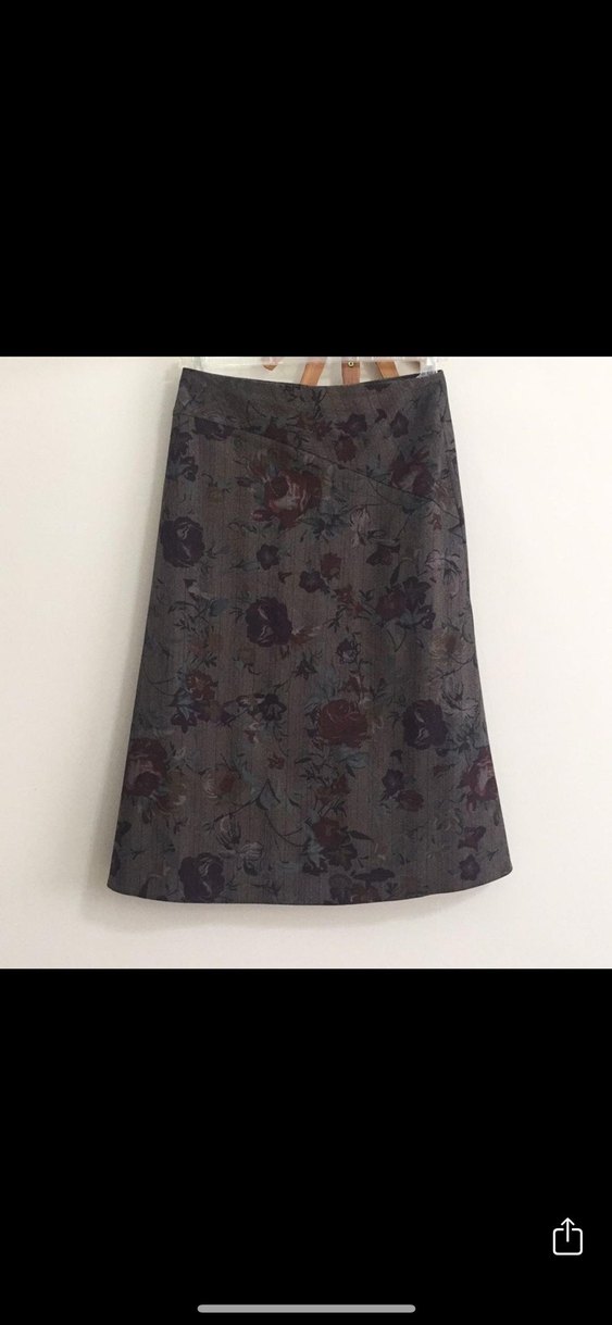 Koyu kahverengi midi etek, bol kesim ve drapeli stilde. Sentetik kumaştan, hafif çiçek desenli, bohem tarzına uygun.