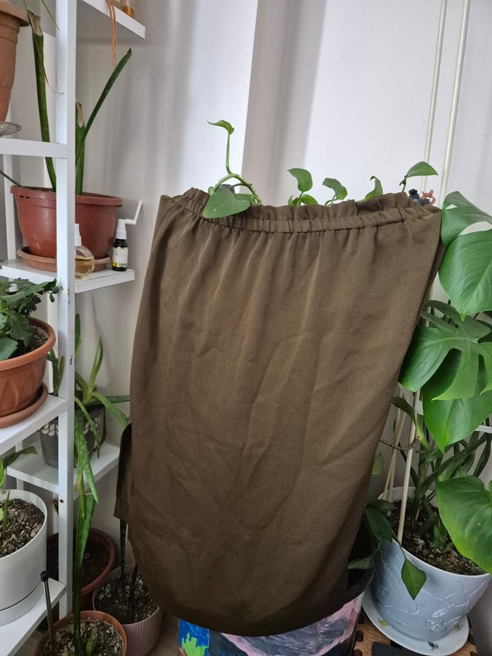 Keten kumaştan, drapeli ve bol kesim midi haki etek. Minimalist ve normcore tarzıyla açık hava kullanımı için uygundur.