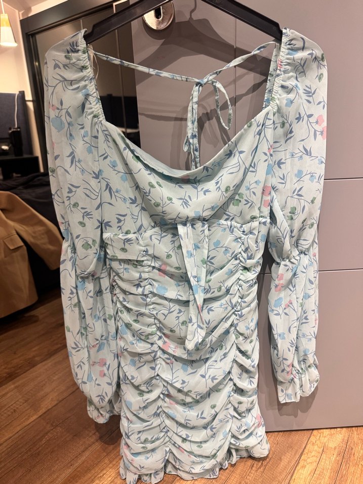 Hiç giyilmedi. S bedene uygundur. Drapeli, V yakalı, askılı kolları olan mini uzunlukta, pastel çok renkli çiçek desenli, bohem tarzda fit kesim elbise.